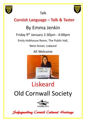 Jan 9 2:30 pm - 4:30 pm Talk & Taster Session: Introduction to the Cornish Language by Emma Jenkin Emily Hobhouse Room The Public Hall, West Street, Liskeard Event Details Get Directions