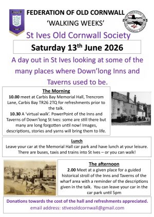 Carbis Bay Memorial Hall 7 Trencrom Lane, Carbis Bay,, St Ives, Cornwall, United KingdomThe morning will be refreshments followed by Margaret Stevens giving a talk about some of the many down'long pubs , taverns and Inns. This will be about 1 and a […]