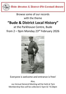 Unless otherwise stated all meetings commence at 7.00 pm and held on the last Monday of the month at the Parkhouse Centre, Bude. Society annual membership fee £10.00, with visitors/non-members £5.00 per meeting.