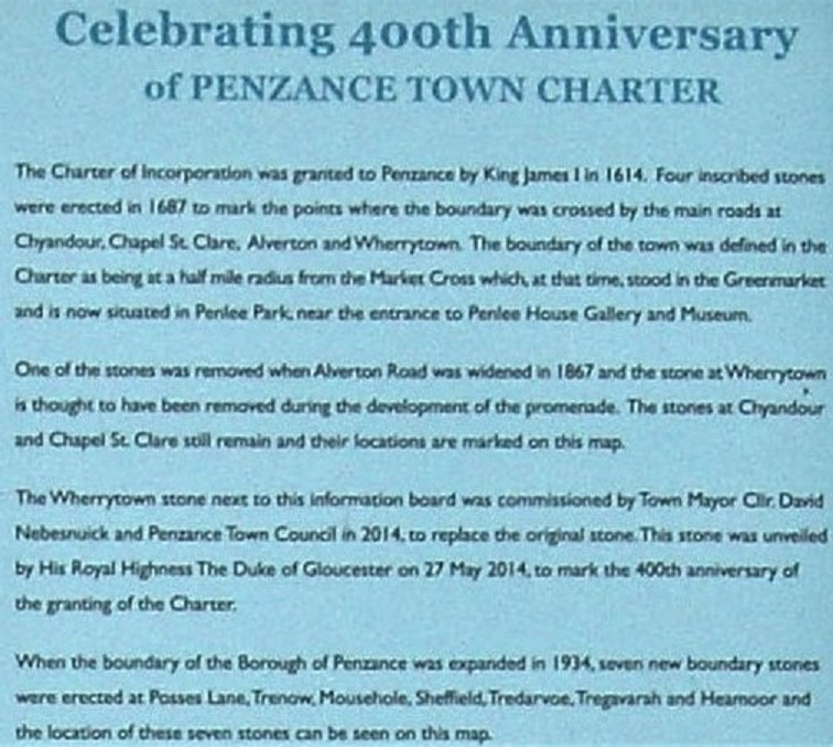 In 2010 Cedric Appleby our recorder at Penzance Old Cornwall Society carried out research into locating the towns boundary stones In 2014 on the 4000th anniversary of the granting of the Town Charter of 1614 this work resulted in the unveiling by the Duke of Gloucester, of a notice board showing the position of all the boundary stones