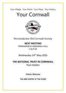 Perranzabuloe Old Cornwall Society meets from September to May on the second Wednesday in the month in Perranporth Memorial Hall with a 7.30pm start.