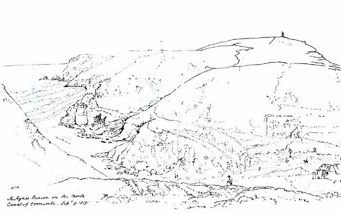 It would appear, however, that the structure was only partly ruined at this date, for a sketch dated the 9th September 1819 of Chapel Porth, with the Beacon in the background, shows a tall building on the top of the Beacon with what looks like a ragged and uneven top.