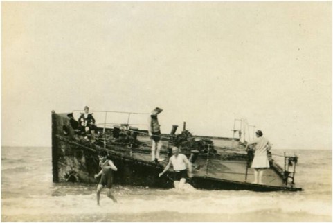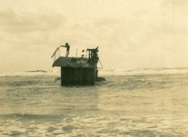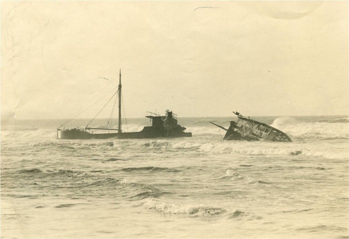 The wreck was partly submerged about 200 yards from shore. Fishermen put out in boats but could find no clue as to the fate of the crew.