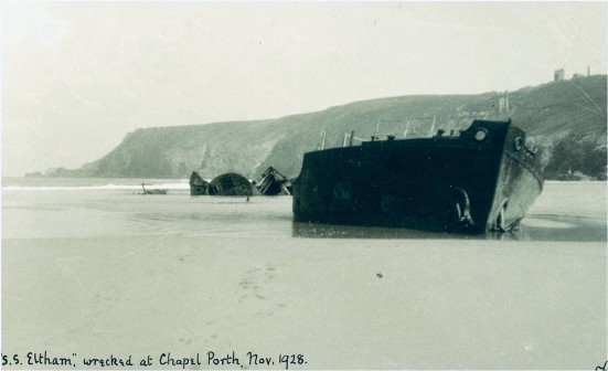 Some of you may have heard of the wreck of the S.S. Eltham at Chapel Porth on the 18th November 1928. She was a 687 ton Liverpool coaster launched by Dublin Dockyard Co. in April 1915. Newspapers report that on the night in question, under the command of her captain Ellis Foulkes, she was en route from Swansea to Rouen with a cargo of coal and was found derelict on the beach during a north-westerly gale early in the morning.