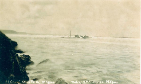 There is still an entire absence of information which will tend to clear up the mystery of the wreck of the Liverpool steamship Eltham, which lies off the rugged North Cornwall coast near Chapel Porth and there is certainly nothing to indicate what has happened to the crew of the ill-fated vessel…It is claimed by those who know the coast that if the crew had been on board when the Eltham ran ashore some of the bodies would have been washed up pretty soon afterwards, as the conditions all favour this. That nothing has been seen lends colour to the suggestion that the crew abandoned the ship a considerable distance from land and entrusted themselves to the mercy of the raging seas in their small ship’s life-boat, which could not have long survived the elements.