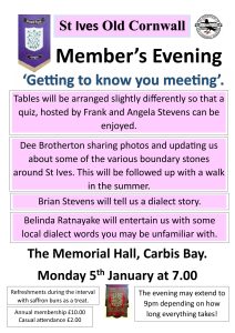 We usually meet on the first Monday in the month at Carbis Bay Memorial Hall with a 7.00pm start. There is lots of parking at the hall and easy access to inside toilets. Refreshments will be served prior to the meeting.