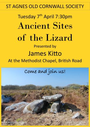 April 7 @ 7:30 pm - 9:00 pm Talk: Ancient Sites of the Lizard by James Kitto St Agnes Methodist Church Hall British Road, St Agnes, Cornwall, United Kingdom