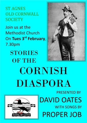 February 3 @ 7:30 pm - 9:00 pm Talk: Cornish Diaspora by David Oates + Proper Job St Agnes Methodist Church Hall British Road, St Agnes, Cornwall, United Kingdom
