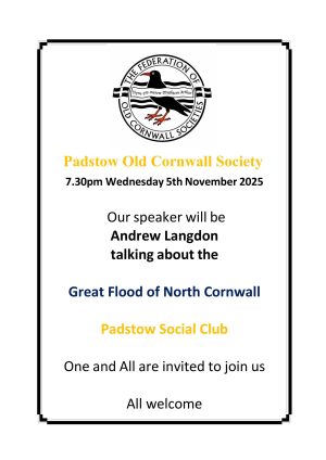 05/11/2025 @ 7:30 pm - 9:00 pm Talk: The great Flood of North Cornwall of 1847 by Andrew Langdon Padstow Social Club The Lawns, Senders Hill, Padstow, Cornwall, United Kingdom