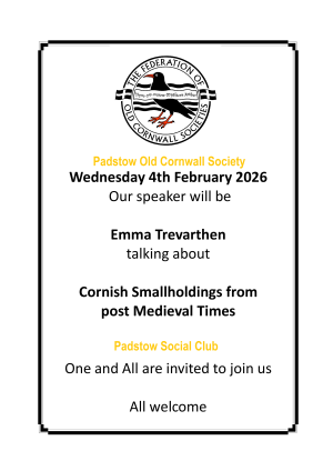 February 4 @ 7:30 pm - 9:00 pm Talk: Cornish Smallholdings from Post Medieval Period by Emma Trevarthen Padstow Social Club The Lawns, Senders Hill, Padstow, Cornwall, United Kingdom